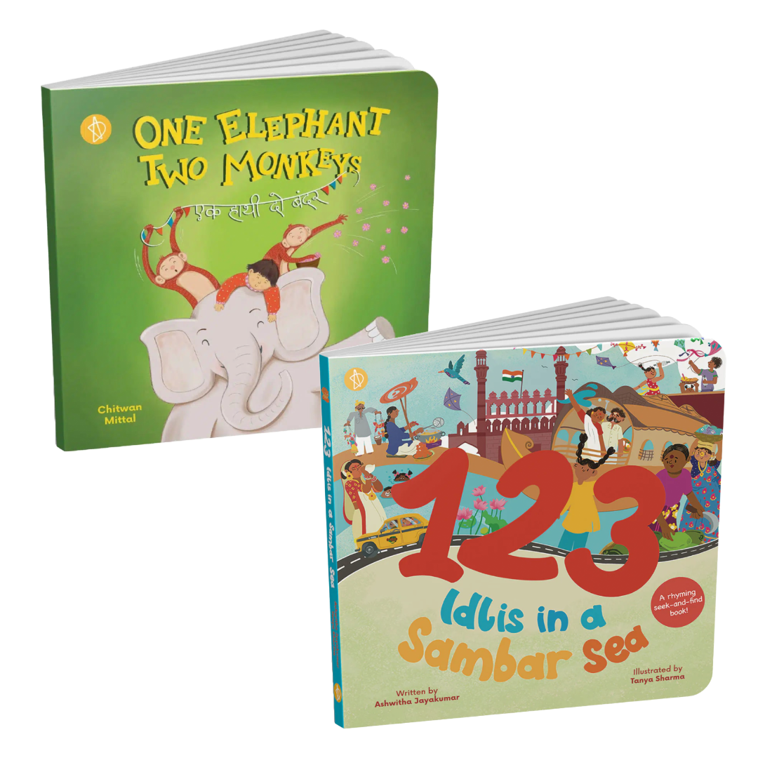 One Elephant, Two Monkeys is a bilingual (Hindi and English) book that introduces children to numbers, animal names and colour names through a little boy’s adventures with his animal friends. It can be read aloud to toddlers and preschoolers (2–4 year olds) or used to